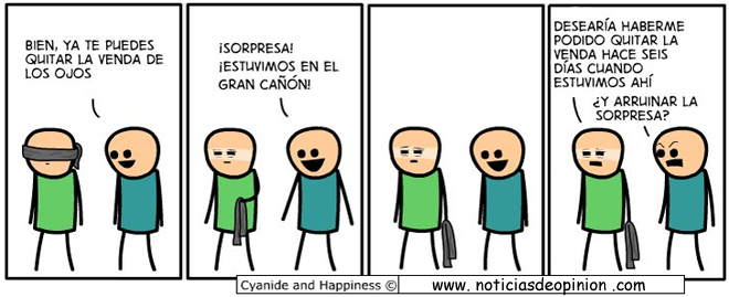 La palabra «sorpresa» suele tener un sentido agradable. Pero no hay que olvidar que, a veces, hay sorpresas que no lo son tanto, y es por eso que decir «me gustan las sorpresas» (para que no nos ocurra como en esta viñeta de Cyanide and happiness en español) es una frase que debería matizarse. «Me gustan ALGUNAS sorpresas».